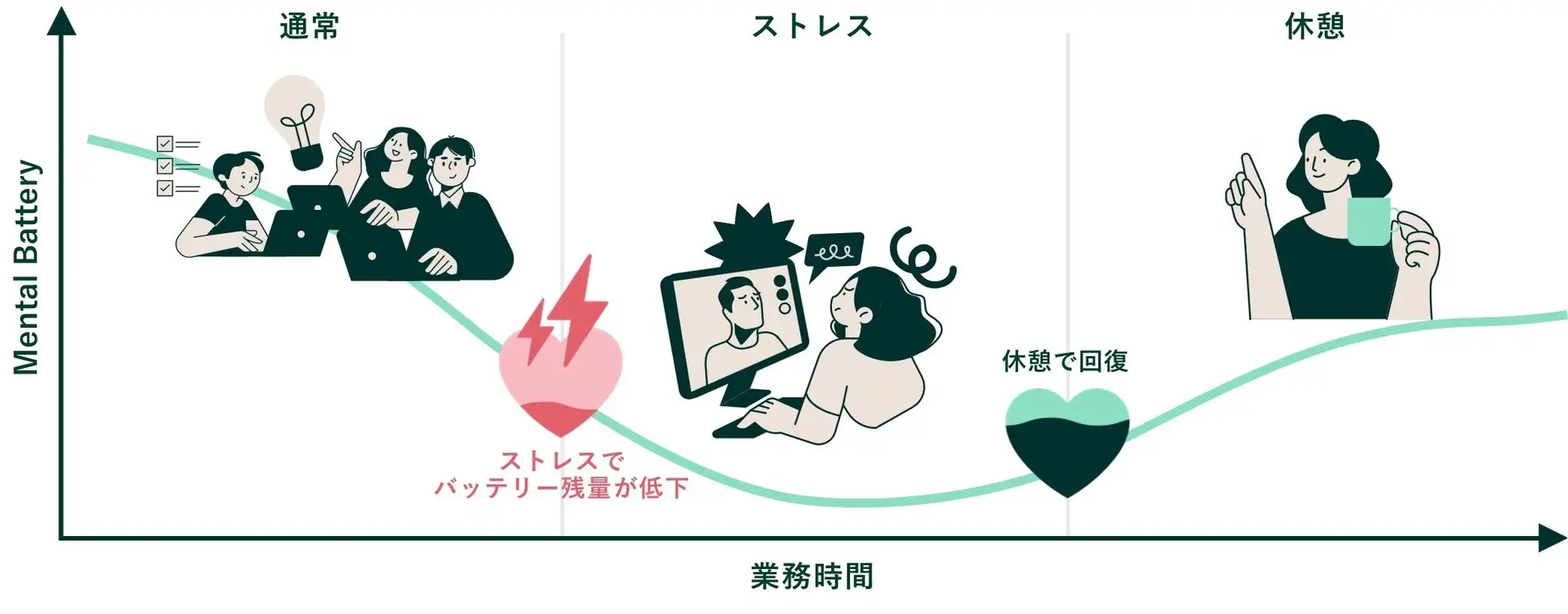 Mental Batteryサービスは、働く従業員の生体データをもとに測定した心の疲労度「Mental Battery」をダッシュボードで可視化し、従業員の「心の疲労度」を時間単位で把握できるようにします。また、アプリを通じてMental Battery起点でのリフレッシュを促すことで、周りの目が気になる等の理由で適切な休憩が取れていなかった従業員にも、業務中の休憩に意識が向くきっかけをつくります。これらの仕組みにより、職場全体の適切な休憩取得を促し、持続可能な働き方への転換を後押しします。私たちは、企業が生産性を維持しながら働きやすい職場環境を構築できるよう支援し、企業全体の健康経営をサポートいたします。
