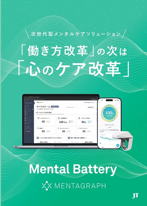 仕事中に装着する高頻度計測センサーを備えた"メンタリング"を中心に、自身のメンタル状態を可視化するスマホアプリ、管理者がチームのメンタル状態を把握するためのダッシュボードを提供しております。